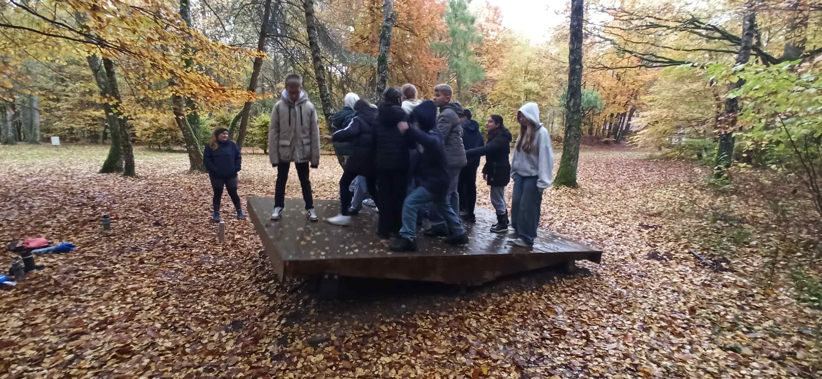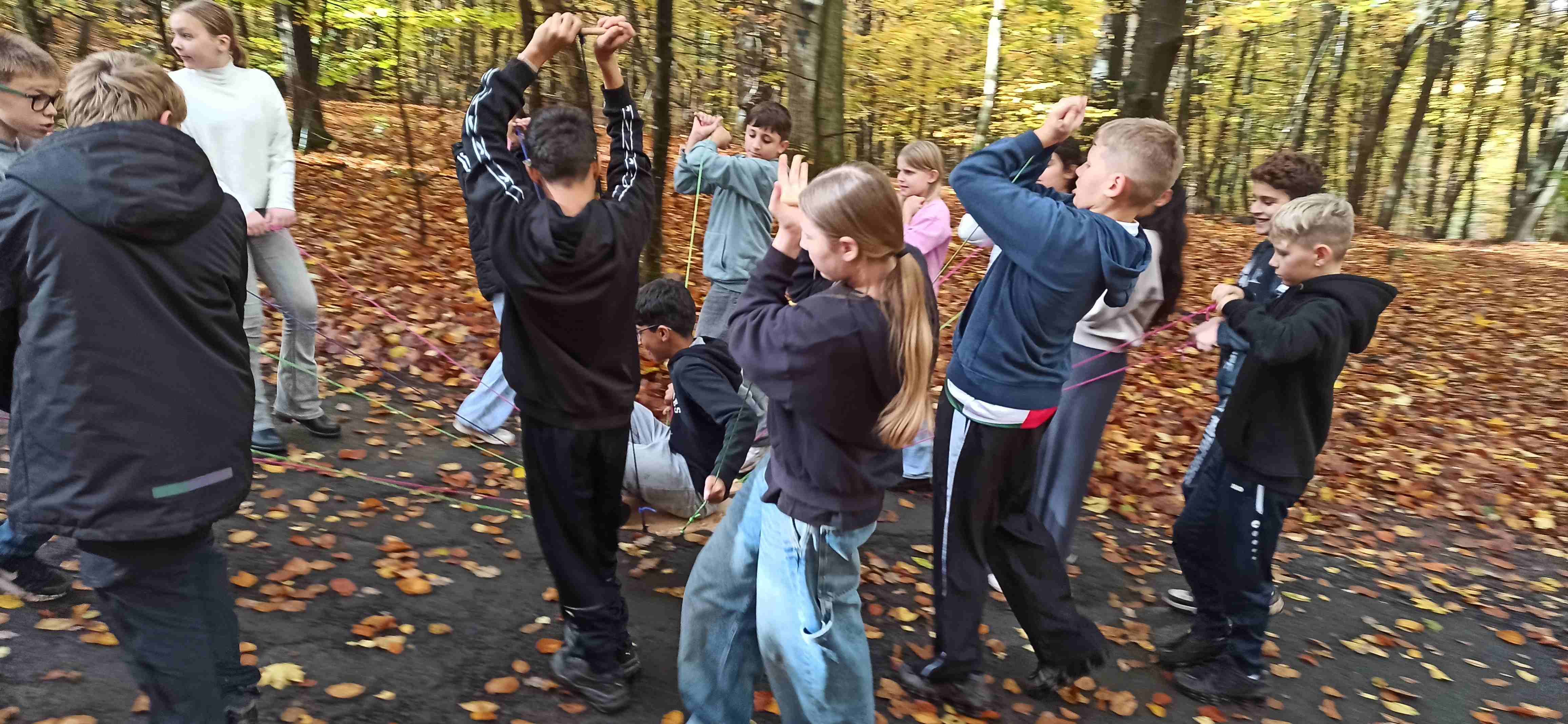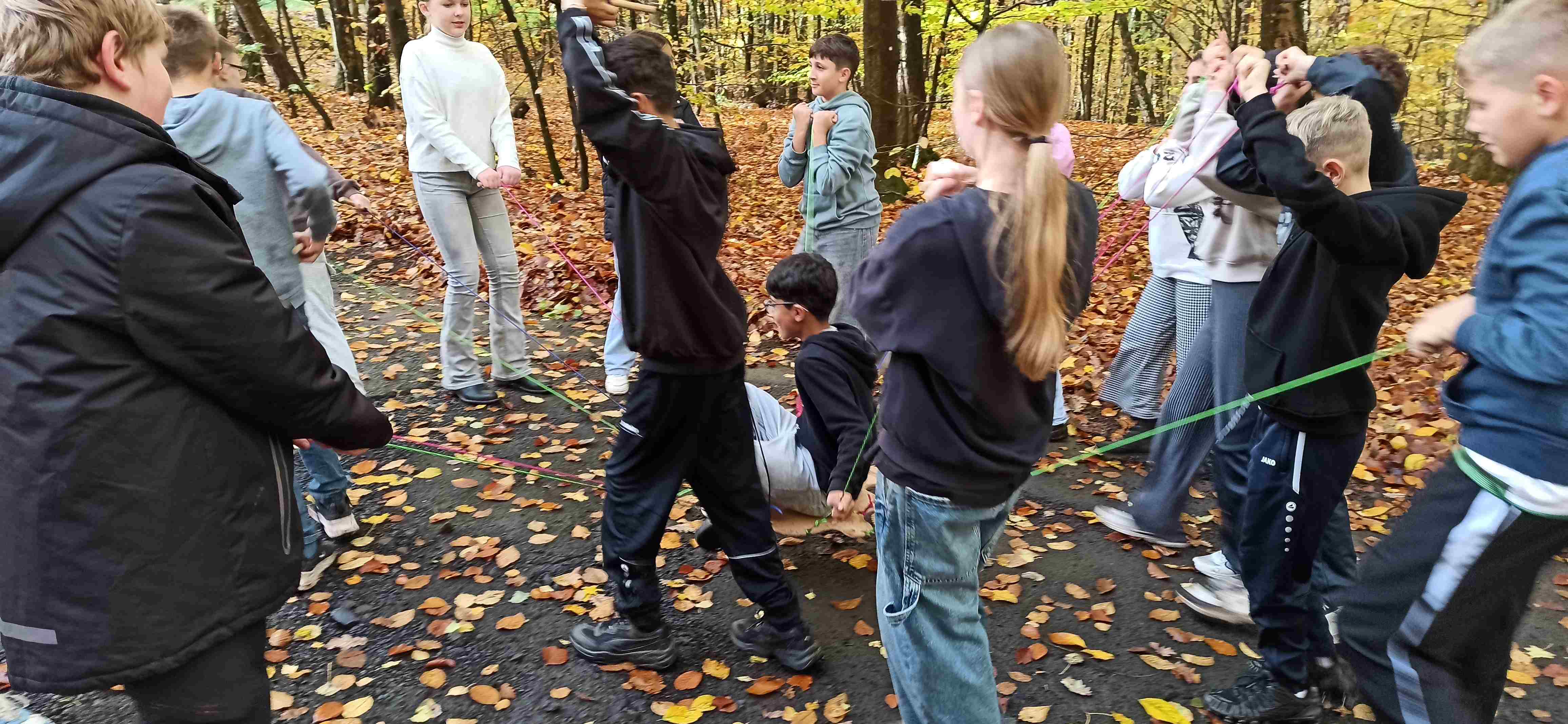 Alle unsere drei fünften Klassen waren in diesem Herbst bereits bei „Klassenfindungstagen“, die in Zusammenarbeit mit unserem sozialpädagogischen Kooperationspartner, der Jugendförderung der Stadt Marburg veranstaltet wurden. Drei Tage hatten die Klassen im Stadtwaldgelände jeweils Zeit, um an herausfordernden Spielen und Kooperationsaufgaben in ihrer Klassengemeinschaft zu wachsen. Besonderer Schwerpunkt wurde dabei auf das gemeinsame Lösen von Aufgaben gelegt. Die Schülerinnen und Schüler hatten dabei sichtlich Spaß, aber auch große Motivation.