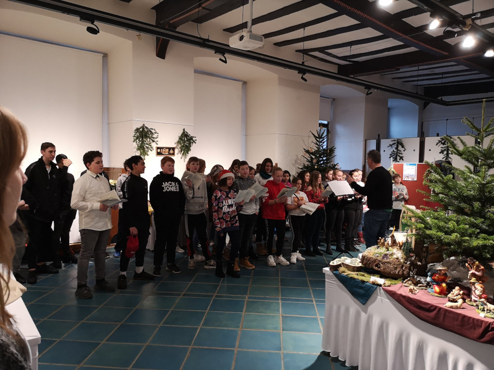 Auch in diesem Jahr zog der Förderstufenchor der EvB unter der Leitung von Gerd Schiebl durch die Marburger Oberstadt, um im Rathaus, im Saal der Krippenausstellung eine erste Kostprobe seines aktuellen Weihnachtsprogramms zu geben.