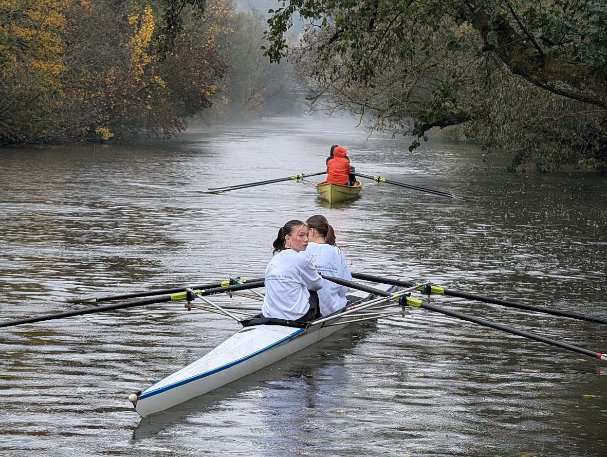 Um so schöner, dass jetzt - bei bestem Wetter - wieder neue Teilnehmer und Teilnehmerinnen zur Ruder-AG hinzugekommen sind und diese tolle Sportart kennen lernen. Die Ruder-AG trifft sich jeden Mittwoch nach der Schule. Schülerinnen und Schüler, die daran teilnehmen, fahren direkt im Anschluss an die 6. Stunde mit der Linie 383 in Richtung Gisselberg.